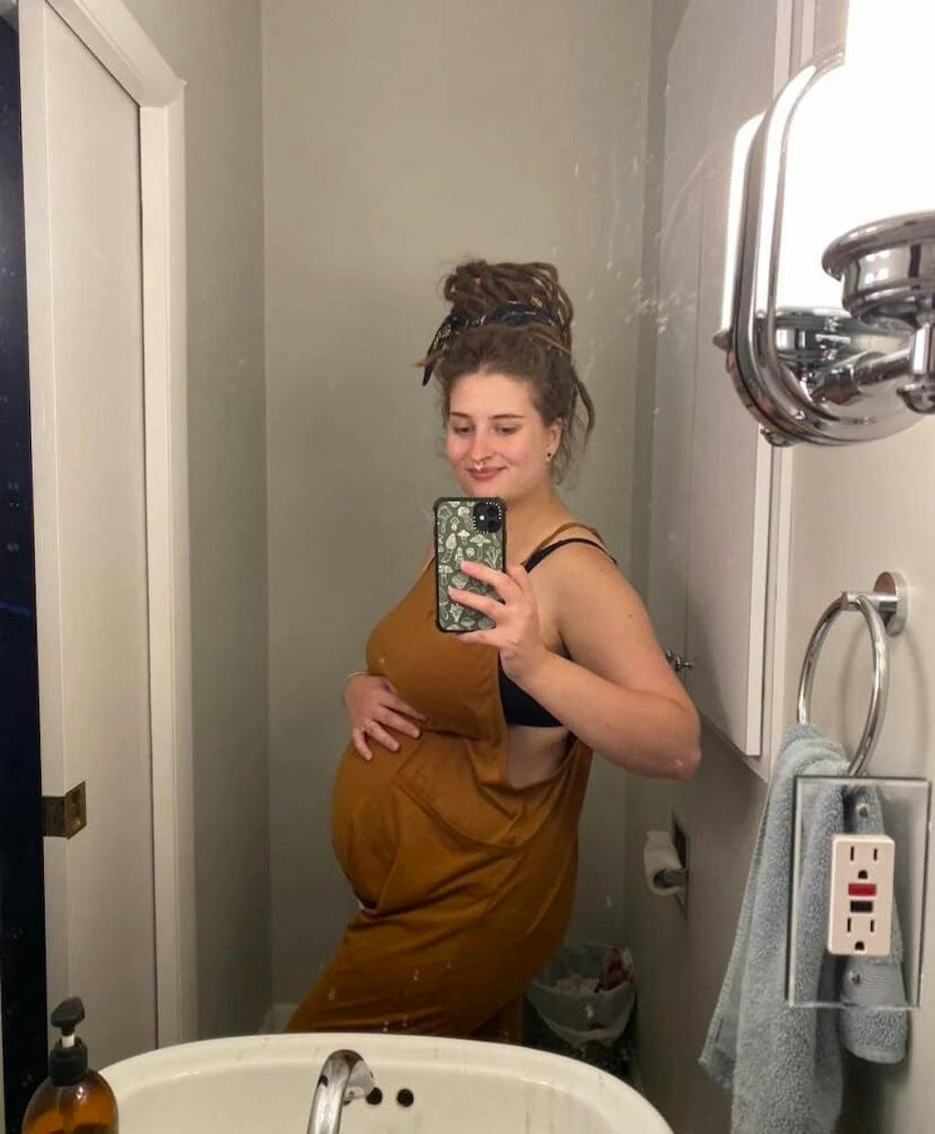 We recommend sizing up for maximum comfort and a relaxed fit, especially if you’re in the later stages of pregnancy or between sizes. The stretchy fabric and adjustable straps provide plenty of flexibility for sizing.