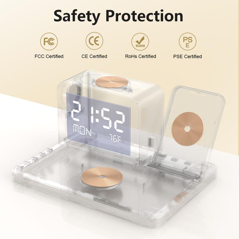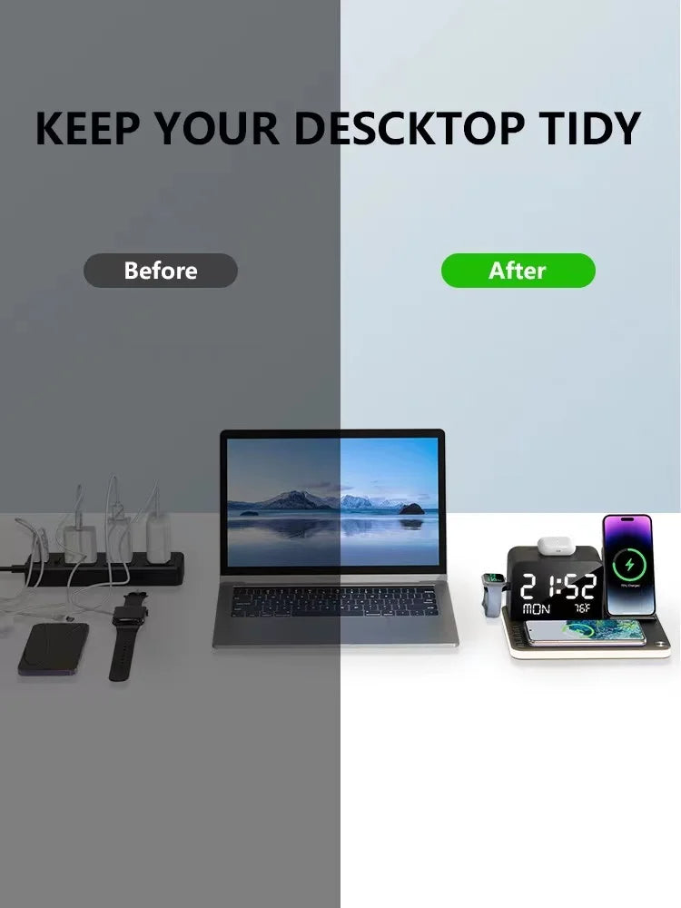 Charge all your devices quickly and wirelessly while enjoying customizable lighting, time sync, and a sleek, space-saving design.