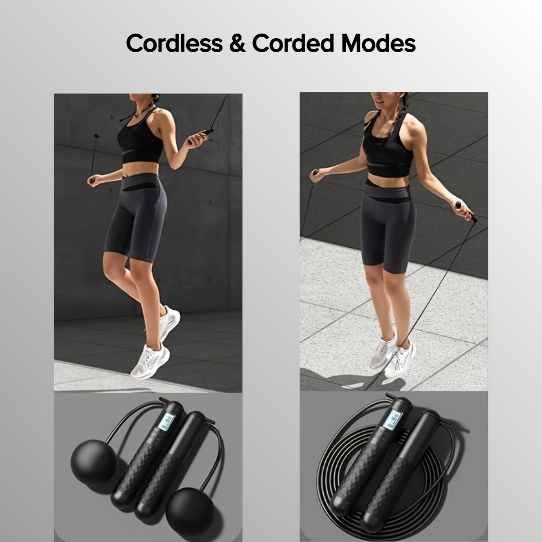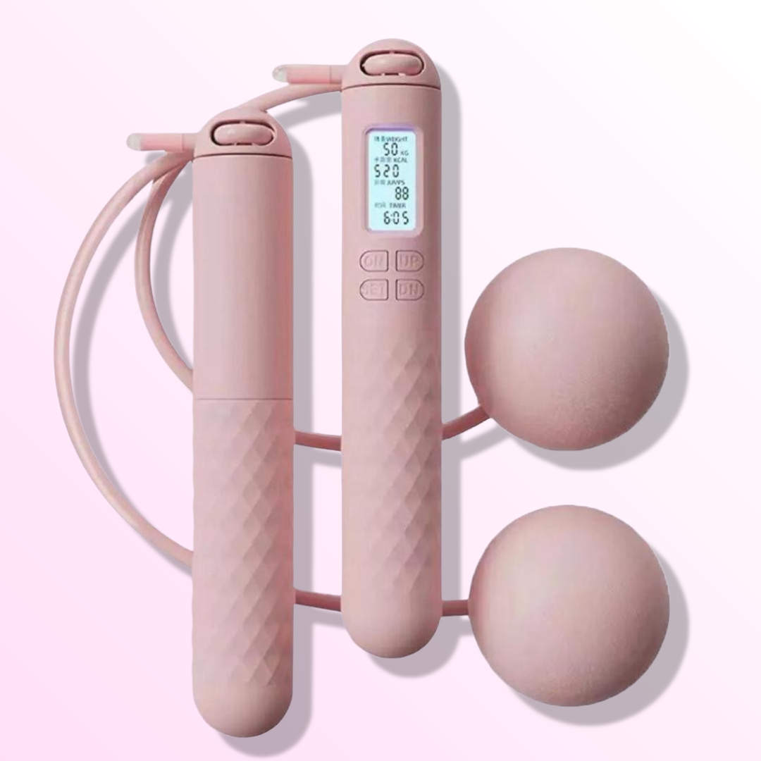 The counter tracks jump count, calories burned, and workout duration. Simply set your weight for accurate readings.