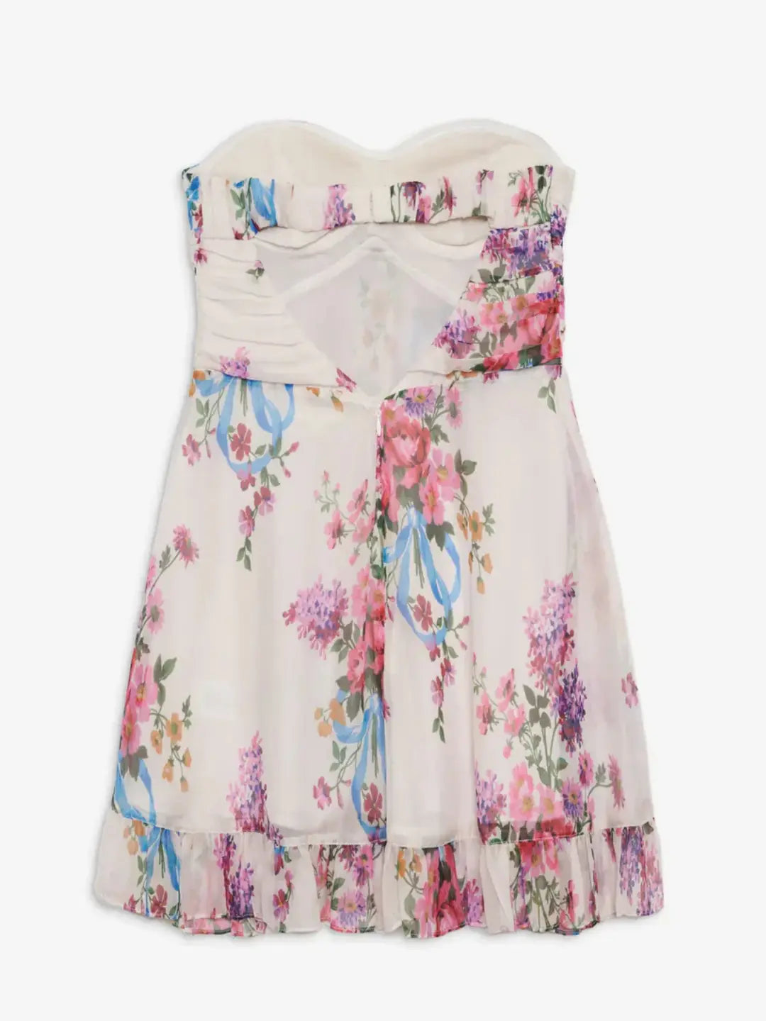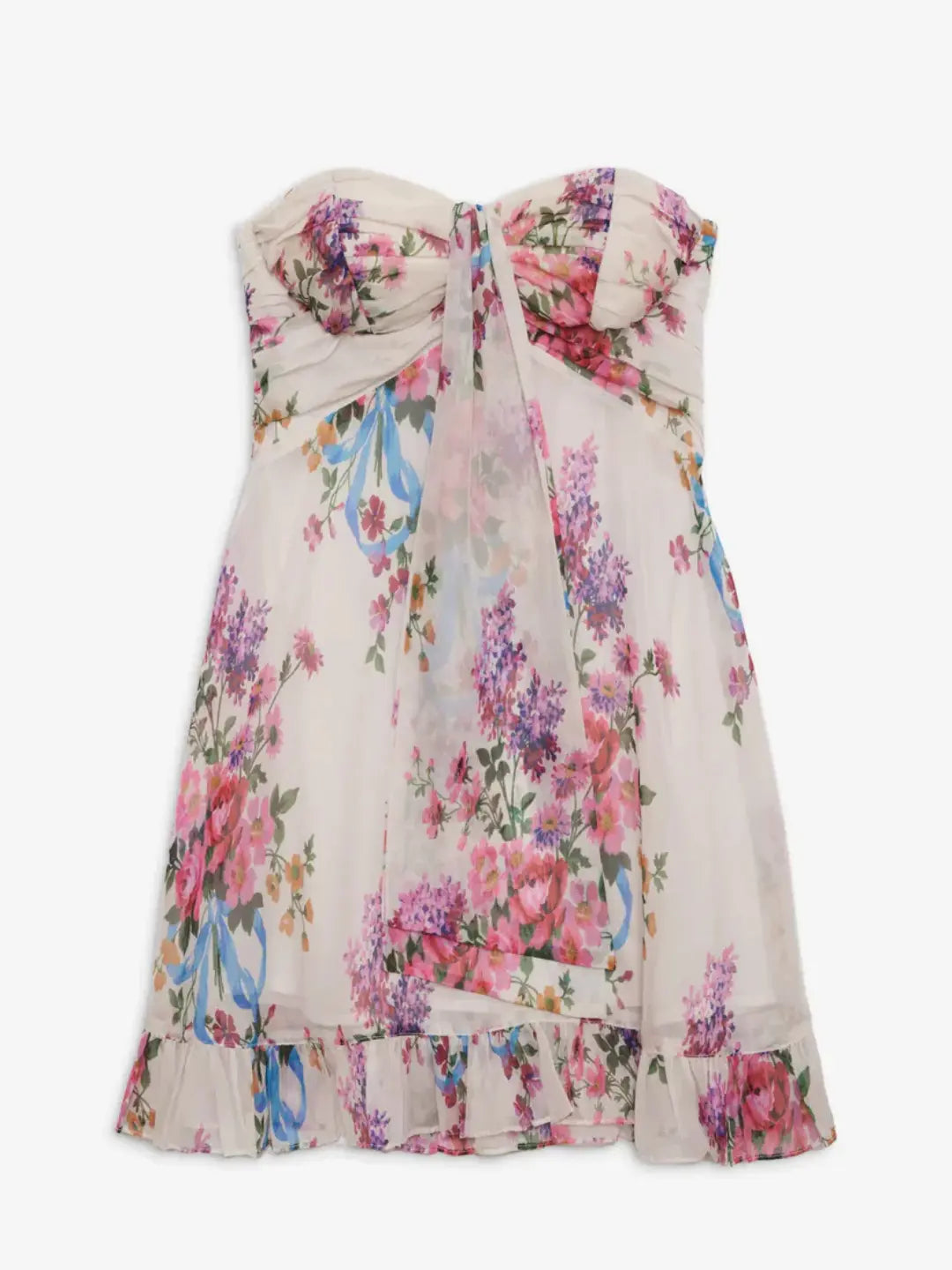Embrace the warmth of summer with the MAEGAN Mini Dress, a stunning strapless design that combines flirty and feminine charm. Featuring a vibrant floral print, this dress flows effortlessly with a soft, lightweight fabric that is perfect for the season. The tie-front detail adds a playful touch, making it a perfect choice for a day at the beach, a brunch date, or a casual evening out.